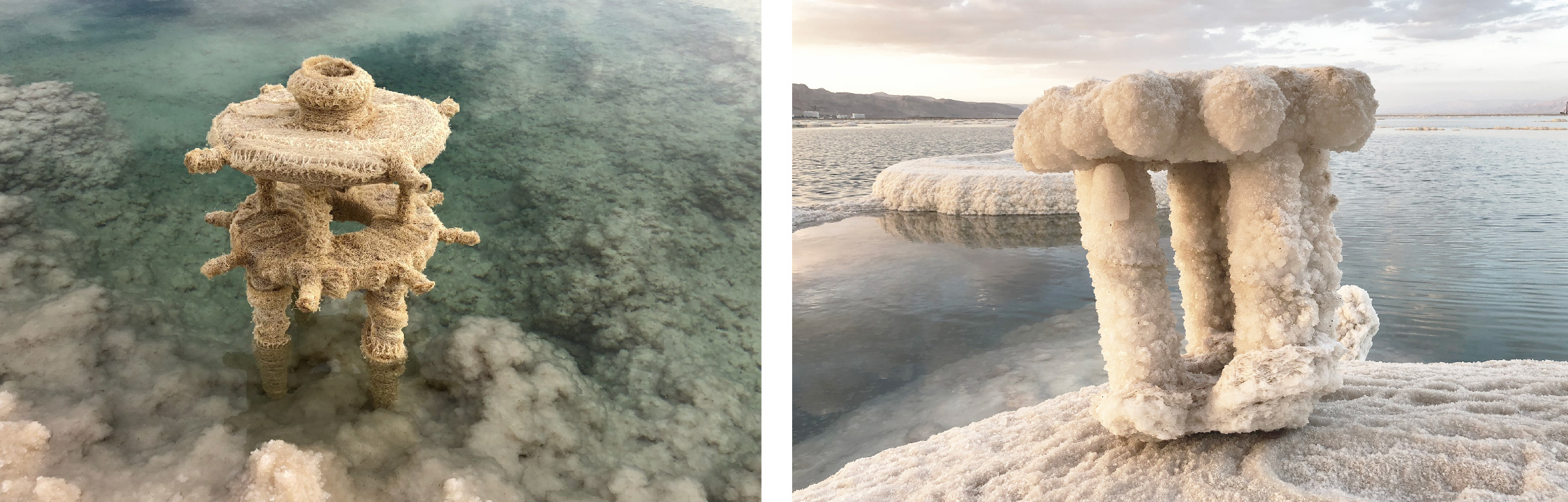 Canlıların yaşama olanağı olmayan tuz oranı yüksek suları dünyanın en vegan yeri olarak tanımlayan Erez Nevi, hazırladığı tabureleri bu suların zeminine sabitliyor. Zamanla taburenin yüzeyinde biriken tuzlar doğal bir tabaka oluşturuyor. Tasarımcı, taburenin yapımının her aşamasında vegan tasarım düşüncesiyle malzemeleri seçiyor. Geri dönüştürülmüş ahşap parçaları birleştirmek için bitki lifleri ve ahşap reçineden oluşan vegan yapıştırıcısı kullanılıyor.